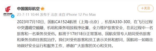 7月10日,多位网友在社交平台称,上海飞往北京的CA1524航班,在空中遭遇了严重颠簸。其中,科普博主邢立达称,自己也是乘坐该航班飞机时遇到颠簸,“空姐和乘客被甩到了顶面”,颠簸结束后,乘客都坐在座椅上,飞机最终晚点时间不长,抵达原定目的地北京,受伤乘客及空乘人员暂时留在机舱内,其他人正常离开。