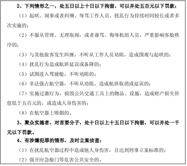 诸如乘机旅客不服从管理、无理取闹,或者谩骂、侮辱机组人员,严重影响客舱秩序,处五日以上十日以下拘留,可并处五百元以下罚款。