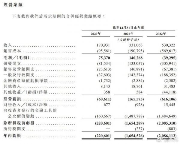 速腾聚创还未实现盈利,2020年、2021年和2022年经营亏损分别为0.6亿元、1.7亿元和6.2亿元。三年累计经营亏损8.5亿元。