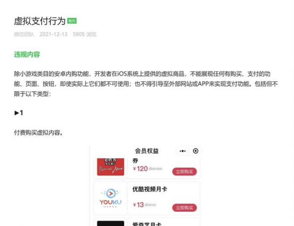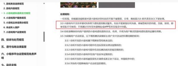 针对 iOS 下的小游戏,图/微信微信在面向小程序开发者的文档中,也明确表示,在 iOS 端禁止各类虚拟支付,开发者不能展示任何有购买、支付的功能、页面和按钮,也不得引导到外部。