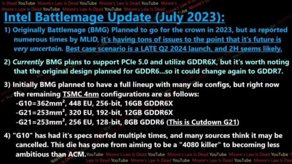 除了 G10 之外,还有两种尺寸的 G21 GPU,最高 TDP 仅 150W,但目前还不是很确定。不过,@Moore's Law Is Dead 之前也提到,高端配置 (BMG-G10) 可能会被取消。