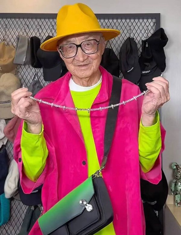 一个满头白发的老人,摆脱了穿白背心、灰色大裤衩加拖鞋的典型老人穿搭,反而是穿粉色卫衣、戴粉色帽子和绿色墨镜,以及最新款的绿色Prada三角包。拍照时,手要插进裤兜,头要仰到天上去,正应了那首《浮夸》:“着最闪的衫,扮十分感慨,有人来拍照要记住插袋。”