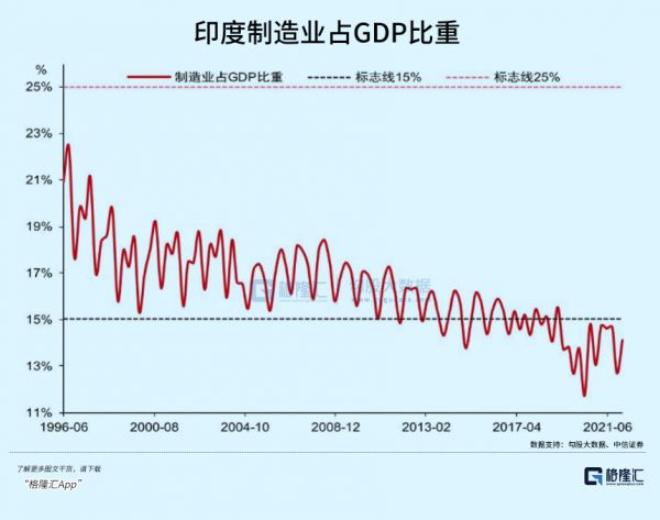 所以近些年,虽然全世界都在吹印度,但真实情况是,印度制造业占GDP的比重越来越低。