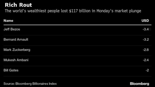 彭博亿万富翁指数(Bloomberg billionaire Index)的21位成员损失了10亿美元甚至更多。其中,亚马逊创始人杰夫·贝索斯(Jeff Bezos)损失最大,该公司股价暴跌,导致其净资产缩水34亿美元。但他仍然是这个世界上最富有的人,拥有1100亿美元身家。