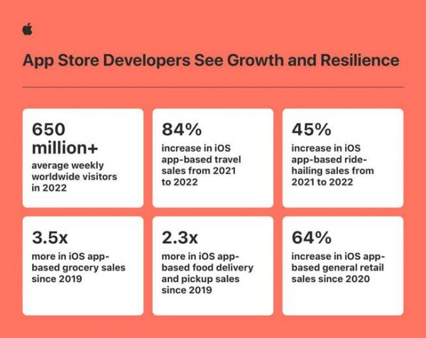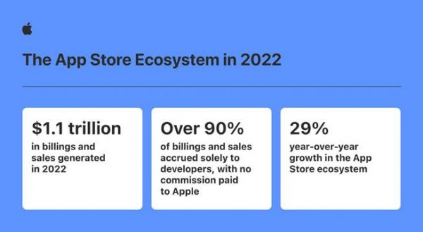 根据苹果上个月发布的报告,App Store 生态系统在 2022 年创下了 1.1 万亿美元(IT之家备注:当前约 7.93 万亿元人民币) 的成绩,同比增长 29%。