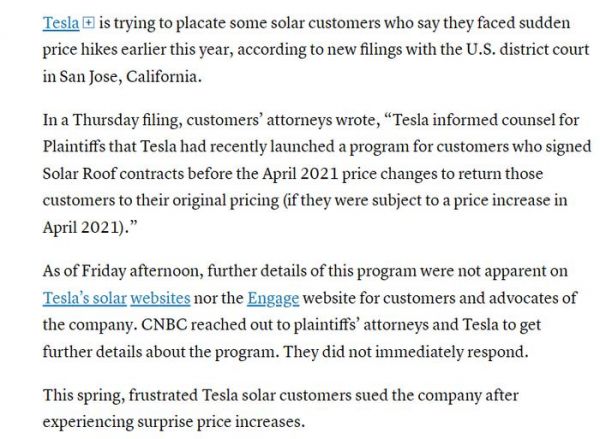 ▲ 图源 CNBC特斯拉此前曾表示,造成太阳能板涨价的原因是,某些依赖进口的组件大幅延迟,这些延迟超出了公司的控制范围。因此特斯拉在 2021 年两度提高了太阳能屋顶的安装价格,并要求订购太阳能板或屋顶太阳能瓦的客户也必须订购 Powerwall 家庭储能系统。