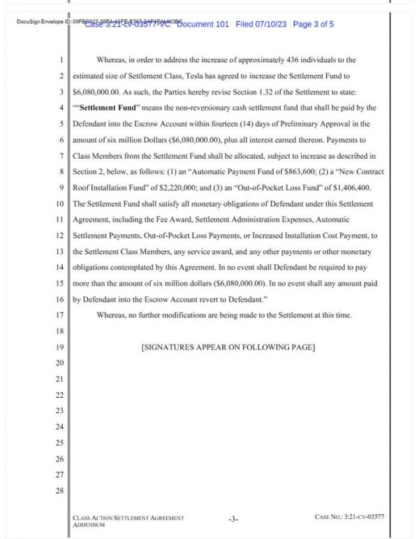 ▲ 图源 集体诉讼文件基于诉讼结果,特斯拉同意支付 600 万美元来结束这场集体诉讼,并以最初向客户制定的价格完成了 1656 份太阳能屋顶合同。