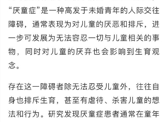 有媒体发表评论文章,援引“厌童症”这个心理学概念,指出这是“一种高发于未婚青年之间的人际交往障碍,通常表现为对儿童的厌恶和排斥,进一步可发展为无法容忍一切与儿童相关的事物,同时对儿童的厌弃也会影响到生育观念”,并进一步指出,这些厌童者是高度自私的“巨婴”,所以无法容忍一个“真婴”。
