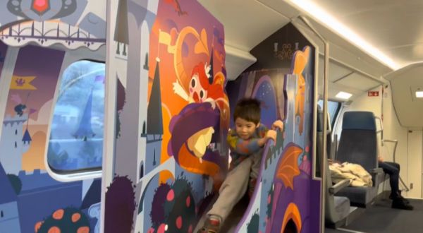 车厢里不仅有想象力丰富的装饰,在二层还设置了小小游乐场,有滑梯、攀爬架、小船和山洞,地面上是防摔面板。大一点的孩子还能向乘务员领取游戏棋,玩着玩着就到站了。