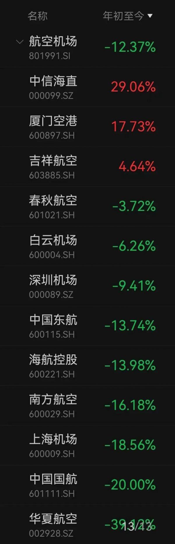 跌幅仅次于华夏航空的航司则为山航B的实际控制人中国国航,年初至今下跌了20%。