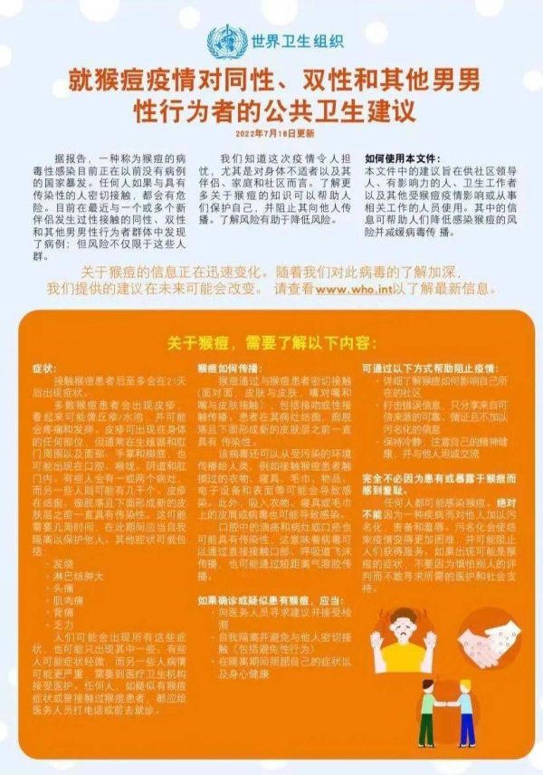 1. 近一个月以来,中国内地已报告10例猴痘病例,结合台湾地区与香港特区的病理情况,感染者大多指向男同群体。世卫组织发布的全球猴痘趋势报告也证实,2022年以来持续爆发的猴痘疫情,主要与一个或多个伴侣发生性关系的男男性行为(MSM)人群相关。