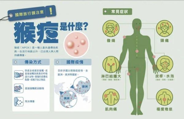 大多数猴痘患者的病变位于肛门生殖器区域,超过一半的患者病变位于躯干或四肢,但病变也可能集中在手掌、足底和面部。其他症状包括发烧、淋巴结肿大、咽炎、头痛、嗜睡、肌痛、直肠炎或肛门直肠疼痛。皮疹或病变持续2~3周,开始为斑疹,发展为丘疹、水疱,然后形成脓疱,结痂、脱落,并可能留下疤痕。