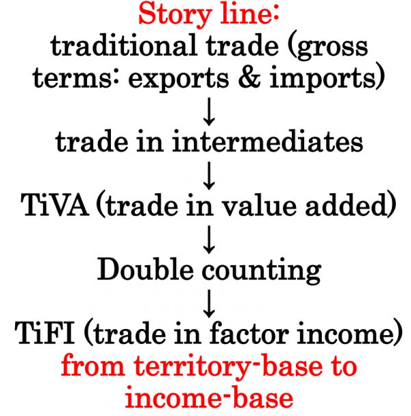 我们提出的新的测算全球价值链的概念,叫做“要素收入贸易”。这一概念有别于传统的贸易统计(总值贸易),也有别于增加值贸易测度。之所以提出这一新概念,主要是因为在全球价值链时代,以总值贸易和增加值贸易为基础的测算方法,存在诸如“所见非所得”的局限性。也就是说一个国家的出口,无论是总出口额还是增加值出口总额,都不一定意味着该国能够得到与之等值的收入。