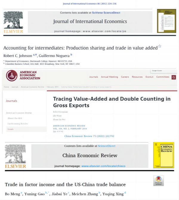 关于总值贸易存在Double counting(重复计算)问题的研究可以追溯到上世纪70年代。直到近些年国际投入产出数据(Inter-country Input-Output Data)的不断丰富之后,进入2010年代,一些前沿的文献才陆续提出了增加值贸易概念(Johnson & Noguera 2012)。美国经济评论(AER)2014年的文章(Koopman et al. 2014),给出了总值贸易的增加值完整分解并从数理上解决了Double counting的问题。我们在前人的基础上,突破了他们基于属地原则定义贸易这一局限,提出了基于企业控制(所有权)这一属权原则的要素收入贸易(Meng, Gao, Ye et al. 2022a)新的贸易概念。