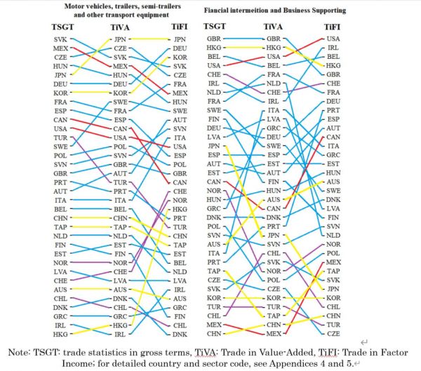我们来看两个行业,一是汽车制造和零部件,二是金融行业。很明显,按照传统方式计算的贸易比较优势,日本、德国、韩国并没有排在前三,而按照要素收入贸易得到的结果发现,这三个国家依次排在前三。这与我们的直觉应该是比较一致的。也就是说,这些国家的汽车品牌价值才是决定其比较优势,也就是真正赚钱的东西。