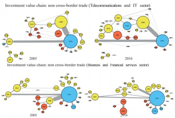 图6:2005年至2016年,通讯和互联网技术行业、商业和金融服务行业的投资价值链在非跨境贸易情况下的网络中心变化(Gao et al. 2023)