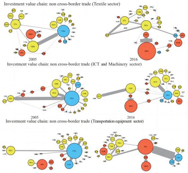 图5:2005年至2016年,全球纺织业、信息通信技术业、汽车制造和交通运输设备行业的投资价值链在非跨境贸易情况下的网络中心变化(Gao et al. 2023)