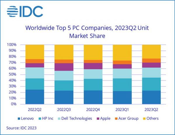 IDC:2023 年第二季度全球 PC 出货量同比下降 13.4%