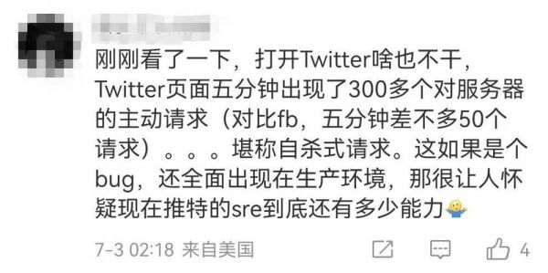 “越来越多的机器人充斥在评论区,发布诈骗或色情信息,显然是审核失灵;从架构、技术上,也明显感觉推特在退化,有时候打不开,前几天还出现了前端自动刷新的bug。”