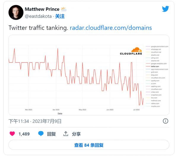与此同时,推特的流量却在下滑。(图/推特截图,数据来源于Cloudflare)