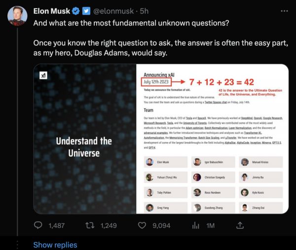 马斯克透露,他选择在2023 年 7 月 12 日公布 xAI,是因为他想借此纪念道格拉斯·亚当斯 (Douglas Adams)的《银河系漫游指南》。