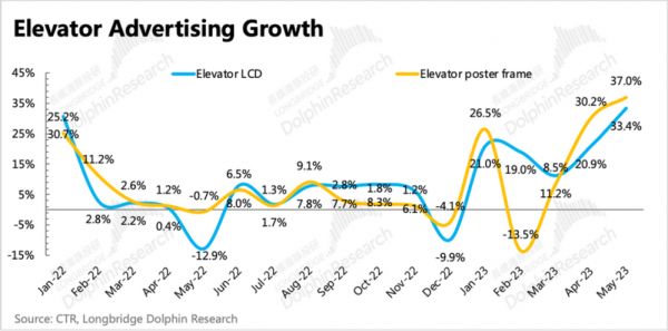 因为去年同期有封控,梯媒在4、5两个月吃尽了低基数的红利,增长超30%。