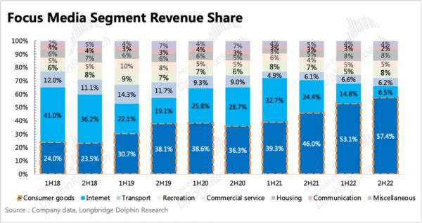 这同样也会影响分众的短期业绩和中长期的估值中枢。去年下半年,分众的收入中日消品广告收入占比57.4%,这个行业对分众业绩有着举足轻重的影响力。往年的台柱子——互联网行业广告,则只占了8.5%的份额。但海豚君也说了,这个结构比例肯定不是常态下的水平。