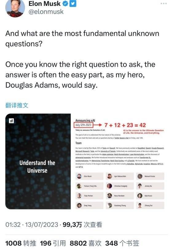 xAI的推特发布了一个问题:“什么是最基本的未解答的问题?”马斯克转发这条推文,圈出公布xAI成立的时间“23(年)”“7(月)”“12(日)”相加,并表示计算结果42是对生命、宇宙及一切终极问题的答案。