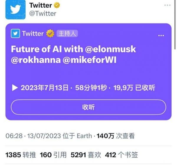 就在宣布xAI成立的当天,也就是北京时间上午7点左右,马斯克和两位嘉宾在推特进行了一场语音对谈直播,持续近1个小时,吸引20万次收听。此外,xAI的官网预告称,当地时间7月14日周五,还会有一场推特空间活动(Twitter Space Chat),欢迎大家向团队提问。