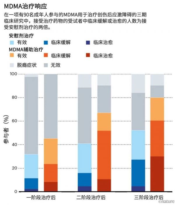 Doblin住在马萨诸塞州的贝尔蒙特,他是非营利组织致幻剂多学科研究协会(MAPS)的创始人和主席。他花了近40年的时间研究摄入致幻剂MDMA(也被称为摇头丸或molly)产生的体验是否能帮助创伤后应激障碍(PTSD)的患者。2021年,MAPS对90名PTSD患者进行的III期临床试验发现,接受MDMA联合心理治疗的患者康复的可能性是接受心理治疗加安慰剂的患者的两倍[1](见“MDMA治疗响应”)。