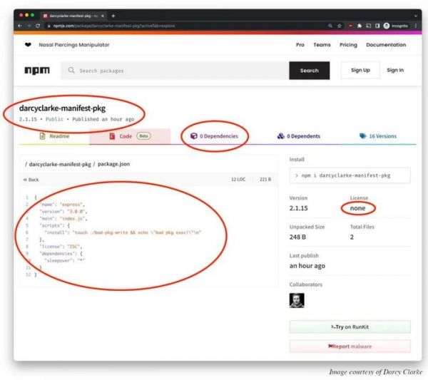 Clarke 说,这一点影响很大。例如,npm 上有个包可能会显示它没有依赖项,而实际上它有。同样,它显示的包名或版本可能与 package.json 中的不同,而这可能会导致缓存中毒。更糟糕的是,它可以隐藏它将在安装期间运行脚本的事实。