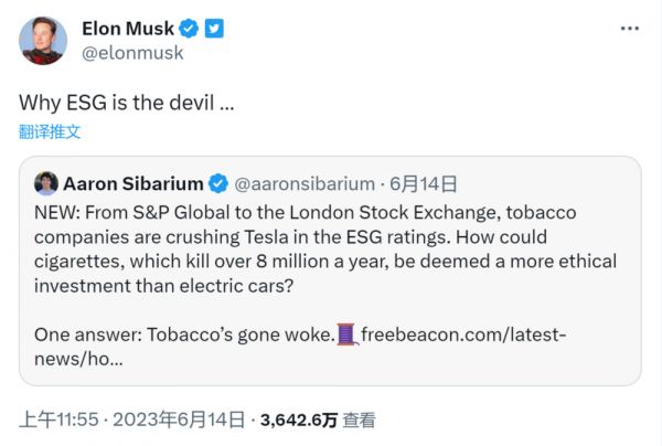 马斯克同志不止一次对ESG(环境、社会和公司治理)开炮。