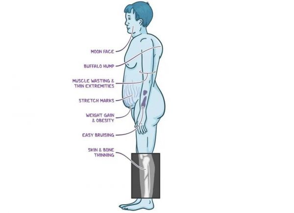 过高的皮质醇水平会增加食欲,而且让人更想吃高脂肪、高糖、高盐的食物,导致肥胖。这种肥胖集中在躯干和脸上,会让背变厚、腰围增涨、脸型更圆,但胳膊和腿依然比较细。与热搜说法不一致的是,脂肪堆积不止在小肚子上,而是整个躯干,体重也会随之增加。