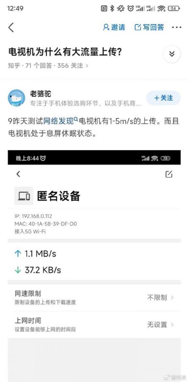 近日,有网友分享了自己新购买的电视机的「神奇经历」。在电视机熄屏状态下,仍保持1-5M/s的上传速度保持工作,这台新购入的电视机,安装的应用只有一个视频平台的TV版客户端,该网友很快就发现了「偷」宽带的真凶。