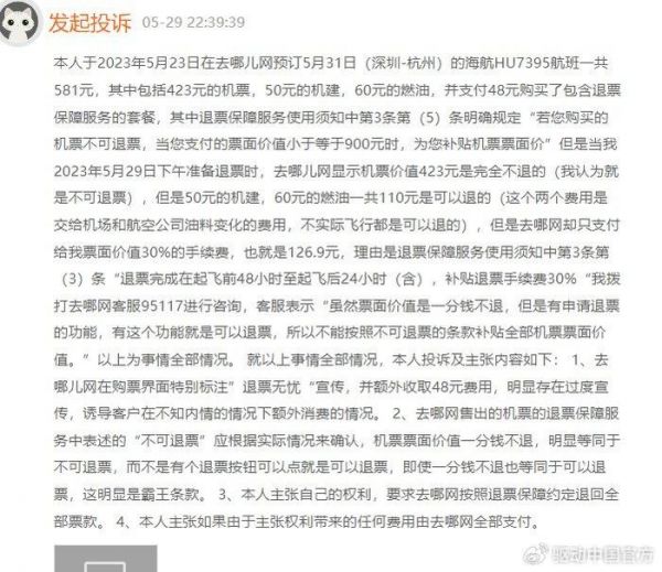 还有消费者投诉,即使购买了退票保障服务的套餐,但是当真的行程有变需要退票时,去哪儿网又是另一番说辞,仅能退还票面价值30%的手续费。该消费者认为,去哪儿网在购票界面特别标注“退票无忧”,并额外收取48元费用,明显存在过度宣传,诱导客户在不知内情的情况下额外消费。购买了退票保障,退票时机票票面价值却一分钱不退,明显等同于不可退票,属于霸王条款。