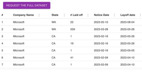 ▲ 图源网站 WARN 根据网站 WARN 统计,今年上半年微软加州已陆续裁去少量员工,3 月到 7 月累积约 100 人。华盛顿州上半年总计则裁了将近 1300 名员工,而今年上半年 Meta 也在加州裁员数十名。