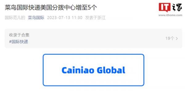 IT之家 7 月 13 日消息,菜鸟国际宣布达拉斯和芝加哥分拨中心于今天正式启用,加上此前投入运营的洛杉矶、纽约、迈阿密分拨中心,菜鸟美国分拨中心已增至 5 个。