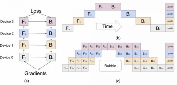Bubble: 在每个批次(batch)中由于高度的管道并行性而导致的延迟或等待时间。它表示在进行高度并行的计算过程中,由于不同部分的计算速度不同,可能会导致某些部分需要等待其他部分完成计算,从而产生延迟或空闲时间。这种情况下,"bubble" 指的是这些空闲或等待的时间间隔。这句话意味着他们可能只是接受了在计算过程中存在一些空闲时间或延迟。