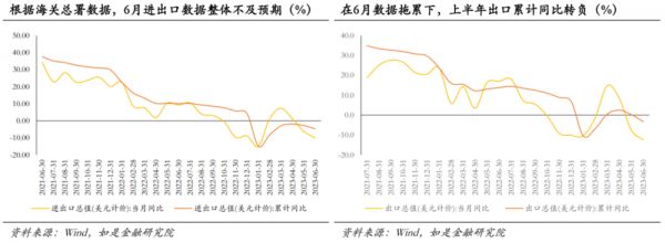 以美元计价出口增速下滑程度超预期。在最近人民币汇率波动较大背景下,美元计价出口比较能真实反映海外实际需求。根据统计,今年上半年我国对外出口总额仅为16634亿美元,较2022年同期的17244亿美元甚至减少了3.2%;6月单月出口总额表现更为不佳,仅为2853亿美元,同比-12.40%;在6月出口萎靡的拖累之下,今年年内的出口累计同比数据也于6月首次转负(1~5月美元计价出口累计同比+0.3%)。根据我们之前的核算,由于2021年和2022年出口数据实现了两年的较高基数增长,如果以2021年为基准,对应两年复合增速应达到4.1%以上,对应今年出口同比应至少为正,才能不拖累全年5.0%经济增速目标。因此综上,在年初几轮波动之下上半年外贸形势整体表现并不及预期。
