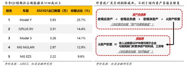 那么从出口品类角度看,其特征是否也会印证外贸的不稳定性?答案是肯定的。2023年出口攀升最猛的工业品是汽车及汽车相关品类。根据一些统计,今年Q1出口新能源车型中,特斯拉占比近四成。这意味着什么?这意味着在国际市场较为有竞争力的车型往往归属于在中国设有工厂的外资品牌,而非自主品牌本身。当然,在统计角度讲,类似这种国外品牌从中国出口统计入中国的经济总量中无可厚非。但值得警惕的是企业的海外设厂行为,本质上是放弃为本国提供就业岗位而寻求最大利润回流。我们在《股市小作文期待的政策组合大概率不会出现》中提出了提升宏观ROE的方式之一是利润的累积,因此海外企业在中国设厂本质并不利于中国国内完成宏观资产负债表的修复。