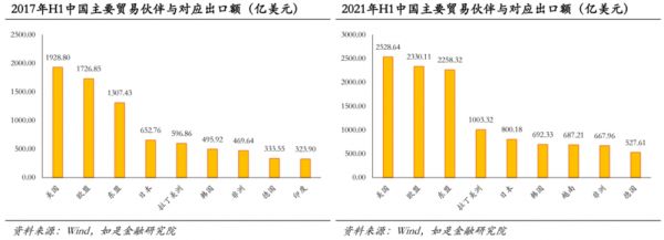 中国的主要贸易伙伴出现了较为明显的迁移。第二个观察上半年贸易形势的角度是国别变动。为了观察贸易伙伴的迁移轨迹,我们选取了三个重要的时间节点,分别是2017年、2021年、2023年,分别对应着贸易摩擦前、疫情转向前,和疫情转向后三个阶段。如果均选取上半年数据,2017年中国的贸易伙伴前五位(以经济体计)分别是:美国(1928.80亿美元)、欧盟(1726.85亿美元)、东盟(1307.43亿美元)、日本(652.76亿美元)、拉丁美洲(596.86亿美元);2021年则转变为:美国(2528.64亿美元)、欧盟(2330.11亿美元)、东盟(2258.32亿美元)、拉丁美洲(1003.32亿美元)、日本(800.18亿美元)。而根据今天海关总署披露的2023上半年数据,当前我国主要贸易伙伴前十位则变为了东盟、欧盟、美国、拉丁美洲、非洲、日本、韩国、越南、印度,第十一位是俄罗斯。