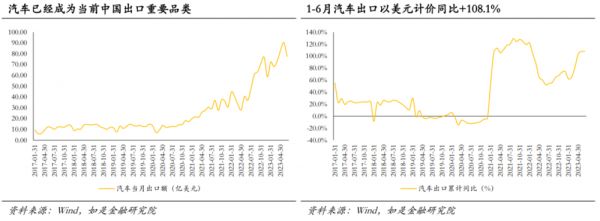 产业链向上攀升是一个事实。据海关总署的统计,上半年电动载人汽车、锂电池、太阳能电池等“新三样”产品,合计出口同比高达+61.6%,拉动整体出口增长1.8pct。其中最为明显的是汽车,今年1~6月汽车(包括底盘)累计出口总额达464.24亿美元,和去年同期同品类出口总额相比增长108.1%,这一增长在边际上还在提速(1~5月汽车出口累计同比+107.9%)。