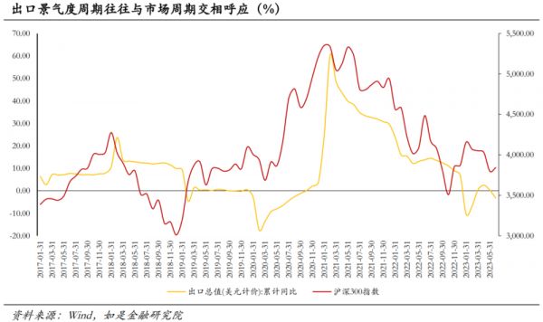 出口周期往往和经济周期与市场周期相互“呼应”。这一论断其中可能的原因有二,其一是外需对于中国经济的促进作用毋庸置疑;其二是出口景气度、人民币汇率、外资举动三者共振。因此在出口弱势周期当中,资本市场的表现往往不尽如人意。