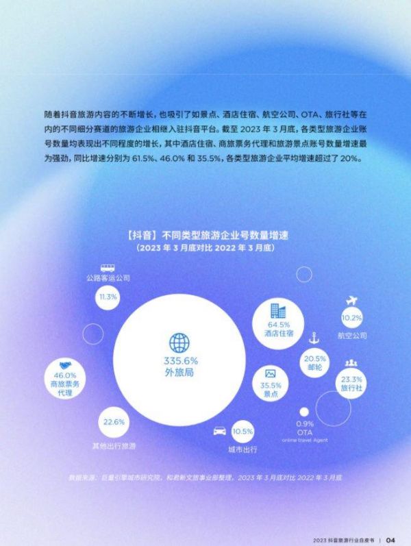 《2023抖音旅游行业白皮书》显示,截至今年3月底,抖音上景点、酒店住宿、航空公司、OTA、旅行社等各类旅游企业账号数量的平均增速超过了20%,其中酒店住宿、商旅票务的账号数量的增速高达61.5%、46.0%。