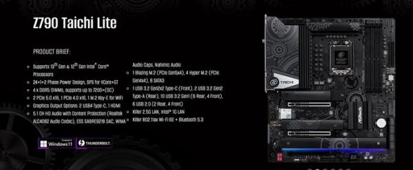 Taichi Lite 系列主板均搭载市面最强的 24 相 VRM 供电设计,并提供包括 PCIe 5.0 接口,可支持最新世代显示卡以及 Gen5 SSD,此外还内建 USB4 Type-C 接口。Z790 Taichi Lite 另搭载 60W PD 3.0 快充功能,可支持手机、平板甚至笔记本电脑。
