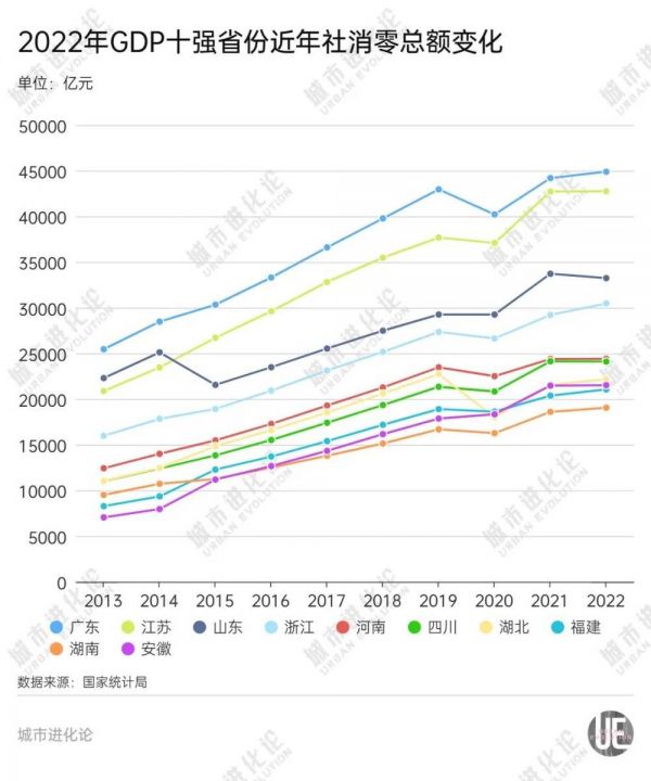 数据显示,过去十年间,河南社消零总额从2013年12426.6亿元增至2022年24407.4亿元,增量不及四川、福建、安徽等经济体量相对更小的省份。