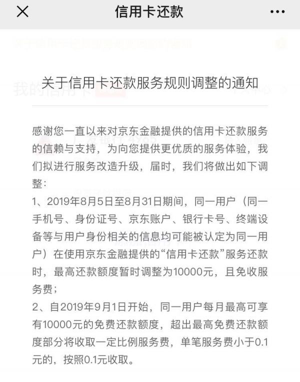 1、2019年8月5日~8月31日期间,同一用户,特别指出,是同一手机号、身份证号、京东账号、银行卡号、终端设备等与用户身份相关的信息均可能被认定为同一用户。在使用京东金融提供的“信用卡还款”服务还款时,最高还款额度暂时调整为1万元,且免收服务费。