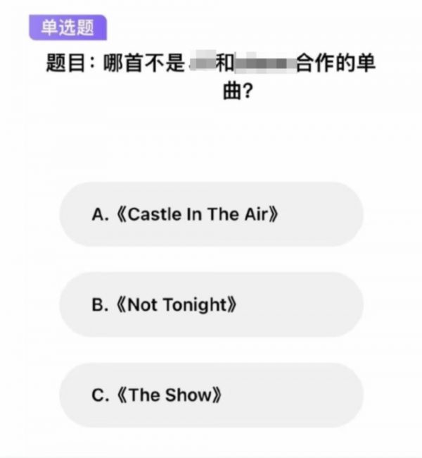 前不久,某歌手演唱会开票。在官方购票平台之一的某软件上,观众需要答对5道题目,才有资格进入抢票页面,答错则会冻结30秒不能答题。题型包括歌手的音乐专辑、日常生活、演唱会趣事等。