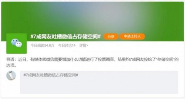 快科技7月13日消息,微博话题“7成网友吐槽微信占存储空间”引发热议。