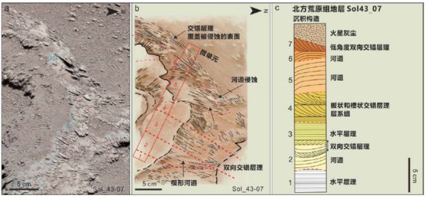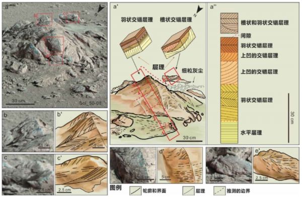 他们发现裸露在地表的岩石上具有明显的交错层理,包括槽状交错层理、上凹的交错层理和羽状交错层理。其中,羽状交错层理指示古环境时期该处的沉积受到了双向古水流的影响。而且,两个方向形成的层系厚度和粒度不同,说明两个方向的水流强度有较大差异。在地球的滨—浅海沉积中,这种层理十分常见。就像两个巨人在争抢领地,同一个位置,河流力量强时砂石就从河流向海洋扩张形成斜层理,海洋力量变强后,砂石就压住先前的斜层理形成另一个方向的斜层理,两个巨人就在不断争斗中留下了交错层理的战斗遗迹。